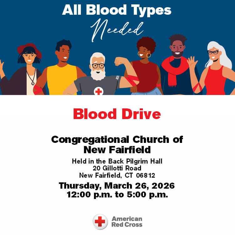Please join us for a blood drive at Congregational Church of on Thursday, March 26, 2026 from 12:00 p.m. to 5:00 p.m. Visit RedCrossBlood.org to schedule an appointment