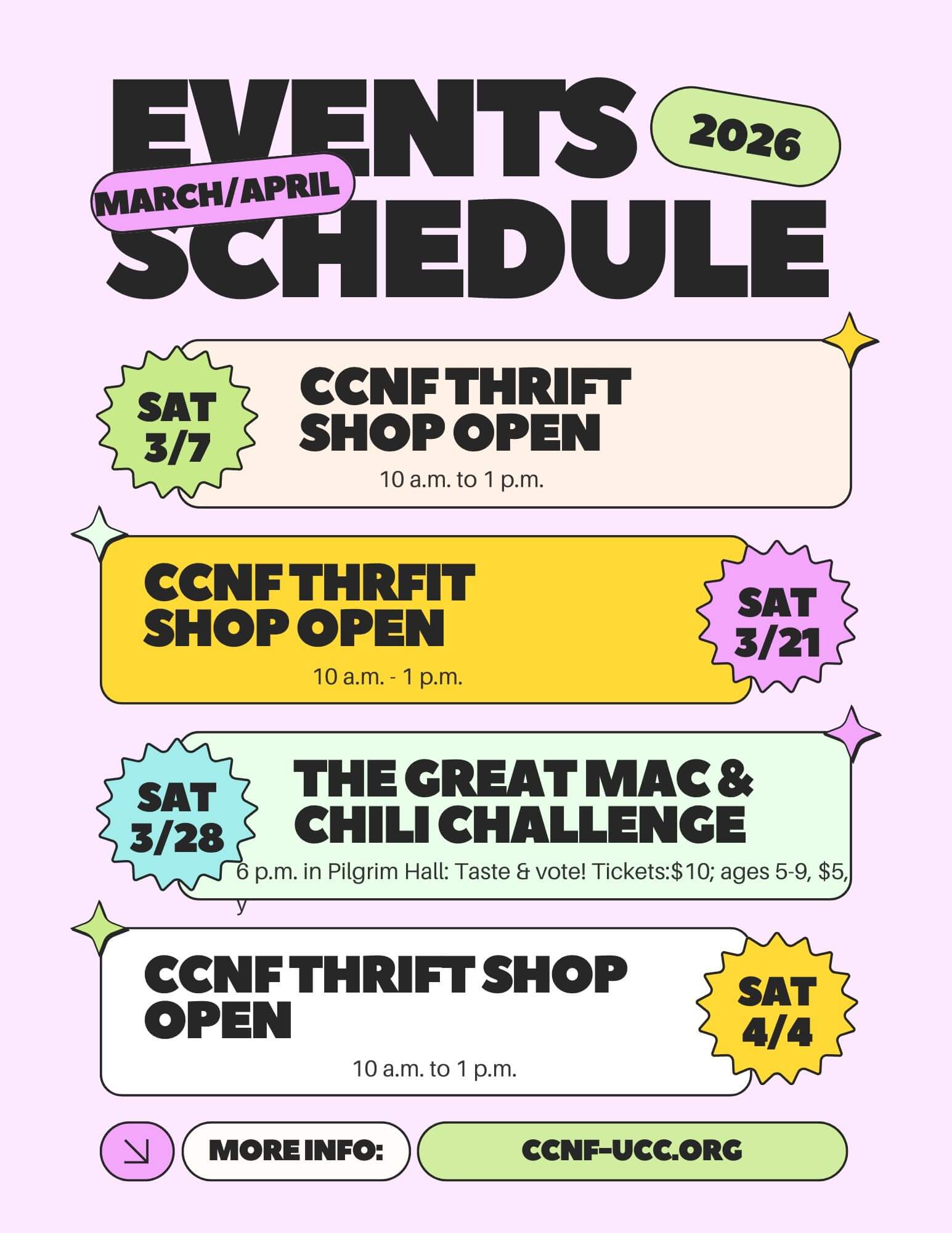 The Great Mac & Chili Challenge returns to Pilgrim Hall (side entrance of church building) for its third year at 6 p.m. on Saturday, March 28! At this fun evening, you can taste the entries in the chili and the mac ‘n cheese challenges, and vote for your favorites. Winners will be announced after the voting closes. Tickets are $10, with discounts for those 9 years old and under. Proceeds suppport the annual youth Appalachian Service Project mission trip, during which the CCNF crew(s) work to make homes warmer, safer and drier for those in need in Appalachia.